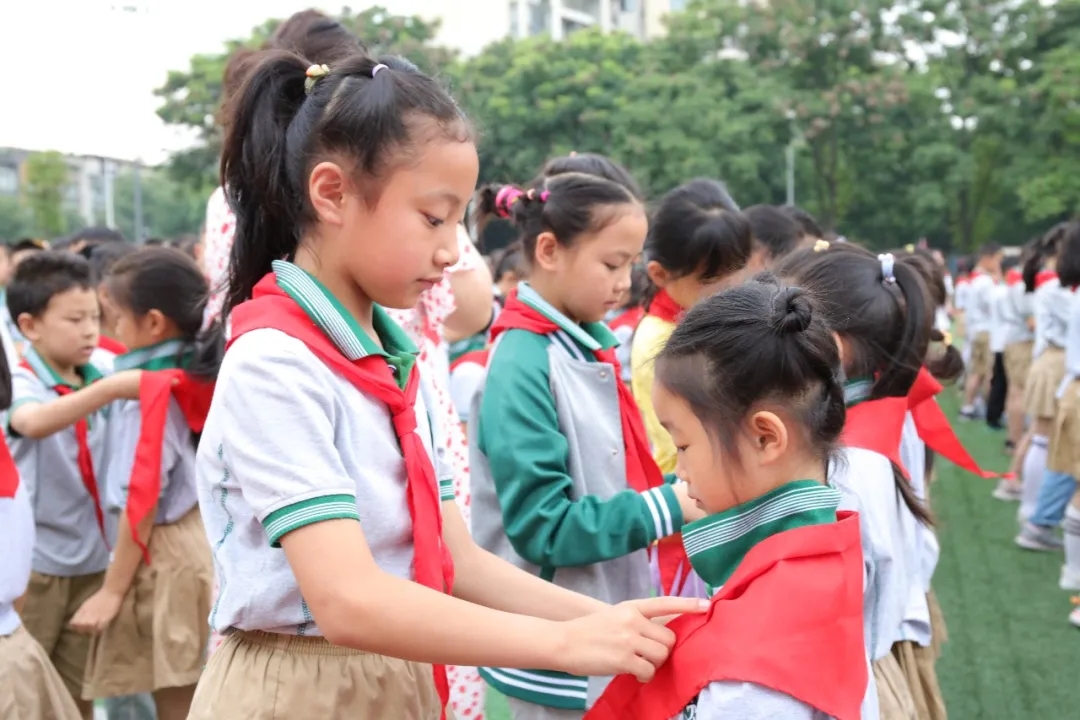 告别五月的成长,迎来六月的喜悦。为深入贯彻落实团中央、教育部、全国少工委出台的将“入队激励:成为少先队员”作为阶梯式激励成长体系的载体之一,有组织、分批次地吸收适龄少年儿童加入少先队,从源头培养少先队员的光荣感和组织归属感。6月7日上午,温江区鹏程小学校隆重举行一年级少先队新队员入队仪式。